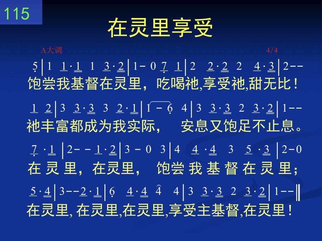 B115在灵里享受mp3教唱词谱清唱伴奏B115在灵里享受(SEL. 114)饱尝我基督在灵里,吃喝他,享受他,甜无比!他丰富都成为我实际,安息又饱足不止息。在灵里,在灵里,饱尝我基督在灵里;在灵里,在灵里,在灵里,享受主基督,在灵里!