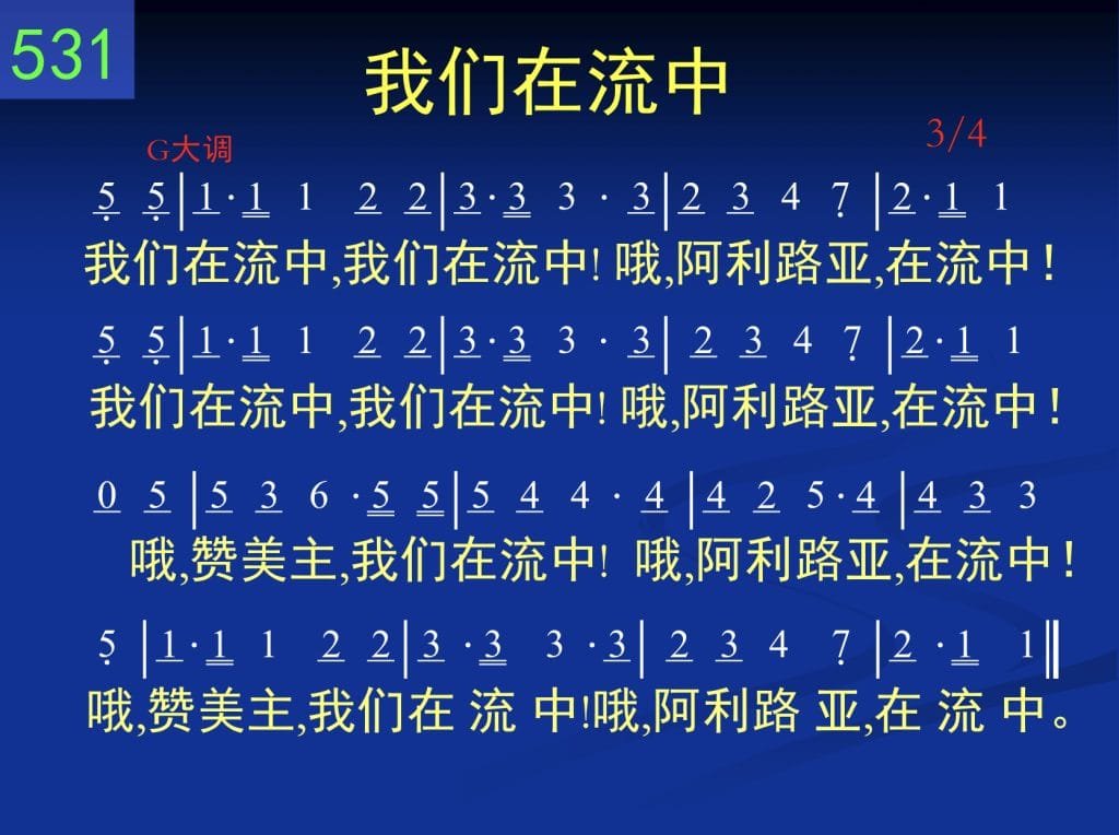 B531我们在流中mp3教唱词谱伴奏补充本,#531我们在流中(SEL. 530)我们在流中,我们在流中!哦,阿利路亚,在流中!(二遍)哦,赞美主,我们在流中!哦,阿利路亚,在流中!哦,赞美主,我们在流中!哦,阿利路亚,在流中。