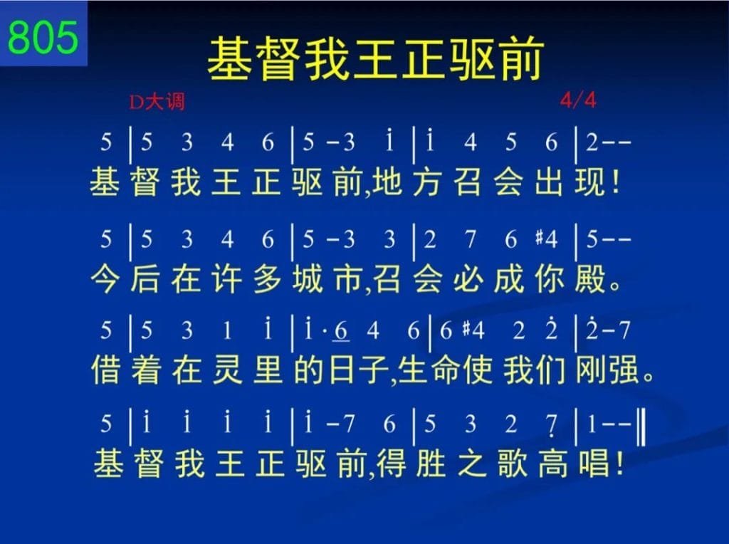 B805基督我王正驱前mp3教唱词谱伴奏补充本,#805基督我王正驱前(SEL. 517)基督我王正驱前,地方召会出现!今后在许多城市,召会必成你殿。藉着在灵里的日子,生命使我们刚强。基督我王正驱前,得胜之歌高唱!