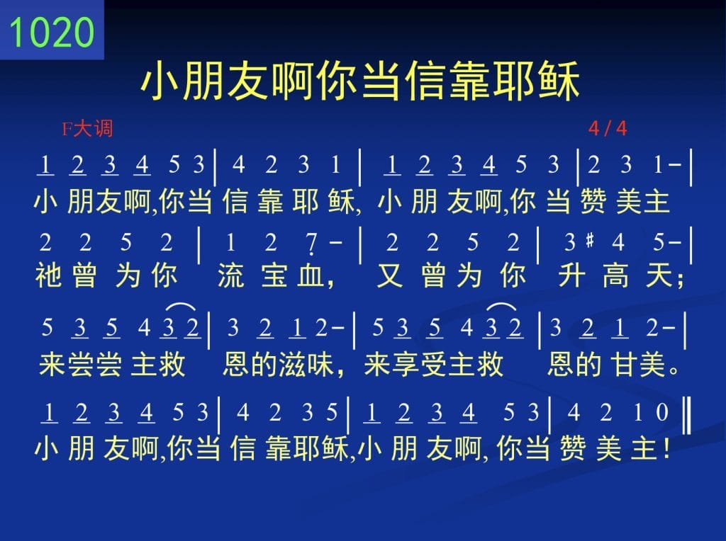 C1020小朋友啊你当信靠耶稣mp3词谱伴奏小朋友阿,你当信靠耶稣,小朋友阿,你当赞美主,祂曾为你流宝血,又曾为你升高天;来尝尝主救恩的滋味,来享受主救恩的甘美。小朋友阿,你当信靠耶稣,小朋友阿,你当赞美主!