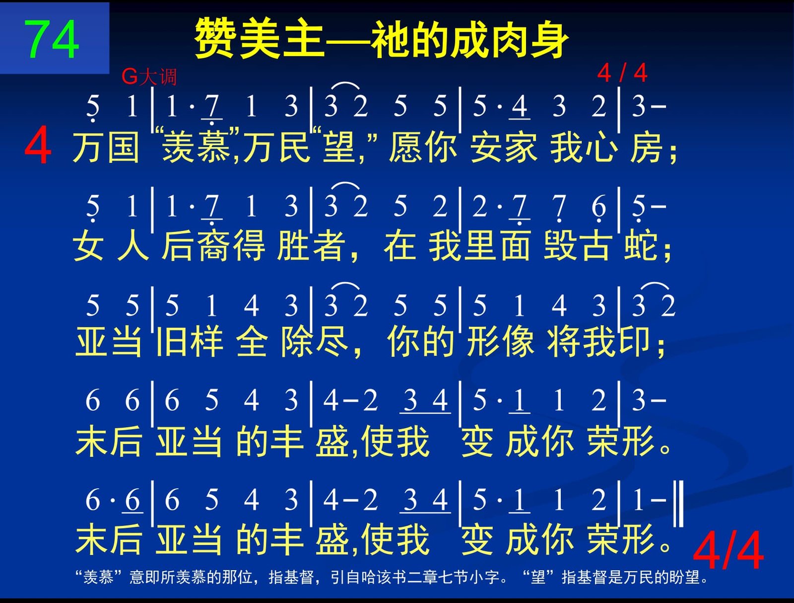 ‘羡慕’意即所羡慕的那位,指基督,引自哈该书二章七节小字。‘望’指基督是万民的盼望。
