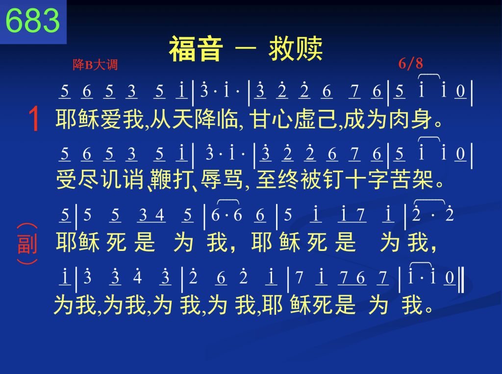 D683耶稣爱我从天降临mp3词谱清唱D683福音-救赎(英998)一耶稣爱我,从天降临,甘心虚己,成为肉身。受尽讥诮、鞭打、辱骂,至终被钉十字苦架。(副)耶稣死是为我,耶稣死是为我,为我,为我,为我,为我,耶稣死是为我。