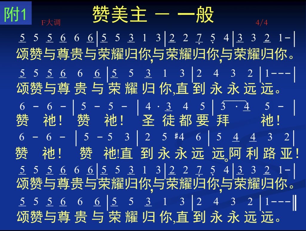 DF1颂赞与尊贵与荣耀归你mp3词谱清唱伴奏D附1赞美主-一般(英241)一颂赞与尊贵与荣耀归你,与荣耀归你,与荣耀归你。颂赞与尊贵与荣耀归你,直到永永远远。赞他!赞他!圣徒都要拜他!赞他!赞他!直到永永远远。阿利路亚!