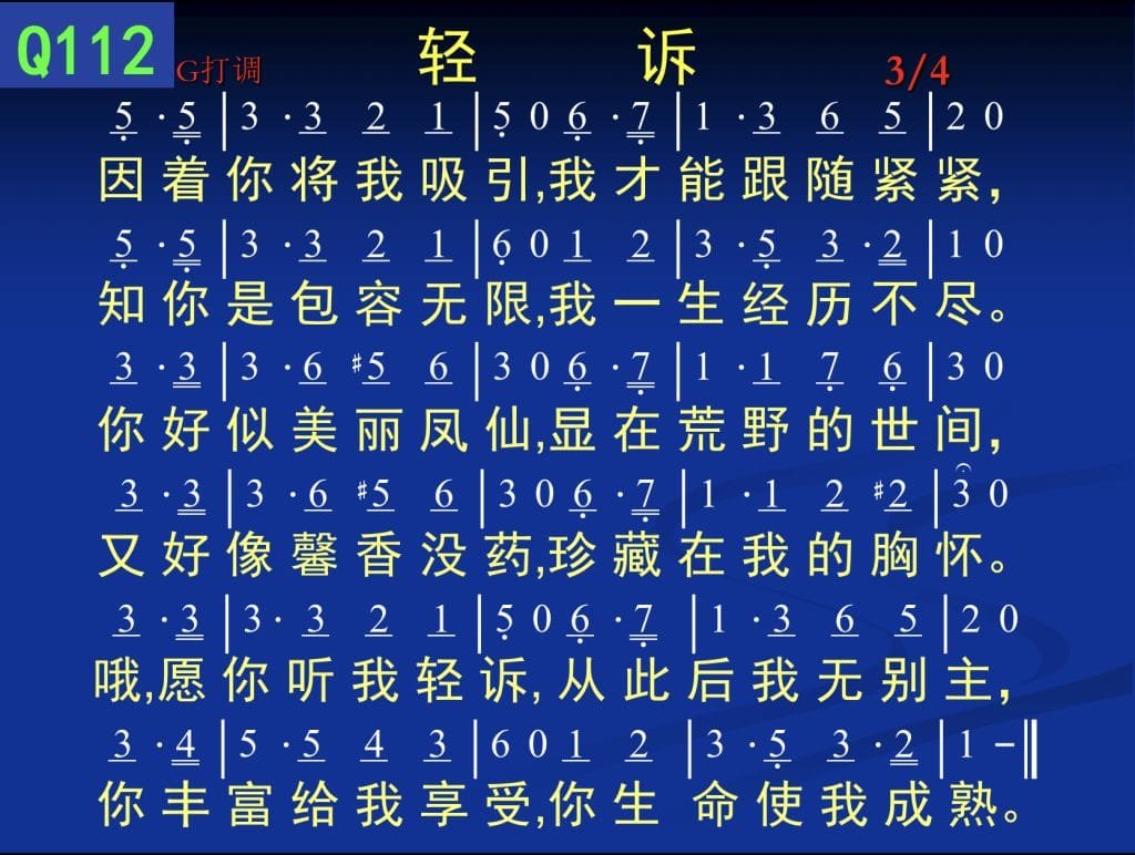 Q112轻诉(B320)mp3词谱Q112轻诉(B320)因着你将我吸引,我才能跟随紧紧,知你是包容无限,我一生经历不尽。你好似美丽凤仙,显在荒野的世间,又好像馨香没药,珍藏在我的胸怀。哦,愿你听我轻诉,从此后我无别主,你丰富给我享受,你生命使我成熟。