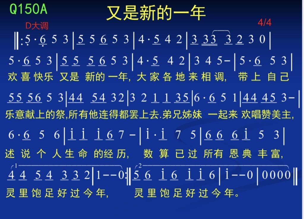 Q150A又是新的一年mp3谱词150A 又是新的一年欢喜快乐又是新的一年,大家各地来相调,带上自己乐意献上的祭,所有他连得都摆上去。弟兄姐妹一起来欢唱赞美主,述说个人生命的狂历,数算已过所有恩典丰富,灵里饱足好过今年。